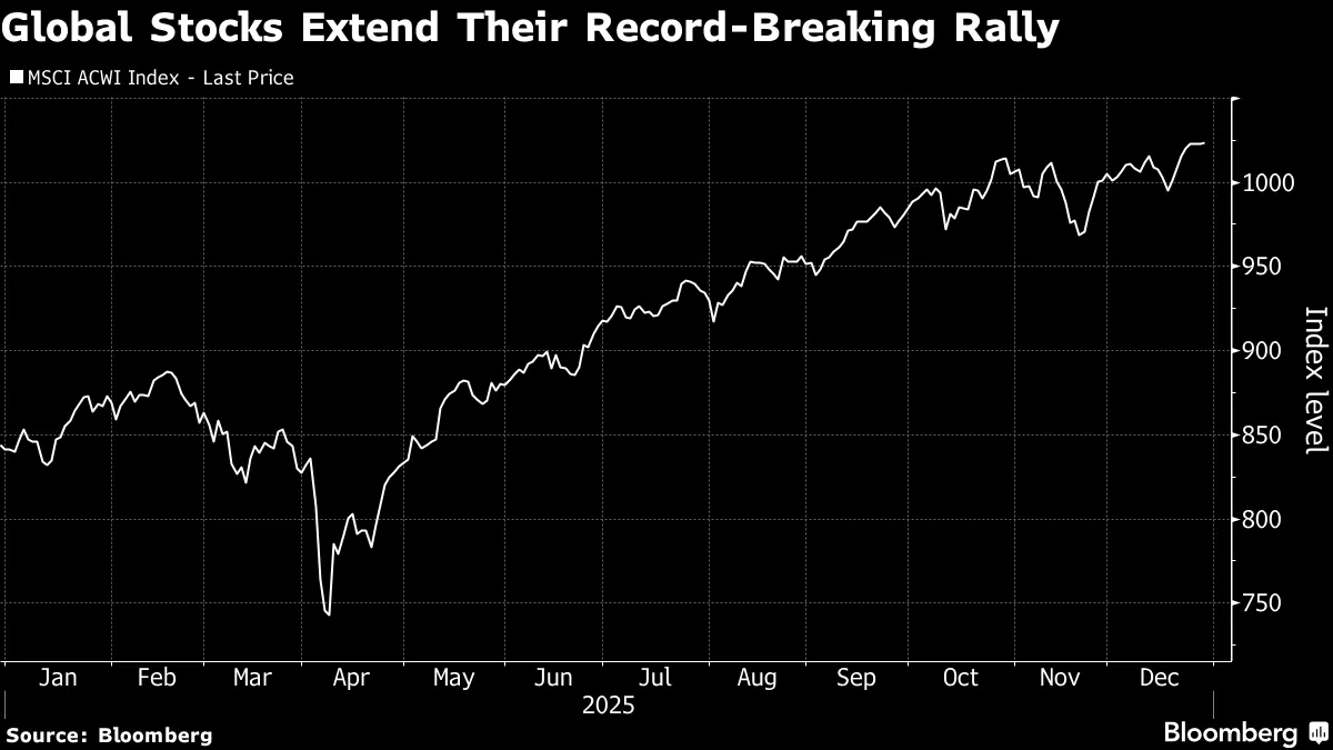 I mercati azionari globali hanno mantenuto i guadagni dopo una corsa da record alimentata dall’intelligenza artificiale, che ha permesso alle Borse di recuperare dal calo di aprile legato ai timori sui dazi. L’indice MSCI All Country World, uno dei più ampi indicatori azionari, è rimasto stabile dopo essere salito dell’1,4% la scorsa settimana, raggiungendo un nuovo massimo grazie al tradizionale rally di fine anno.