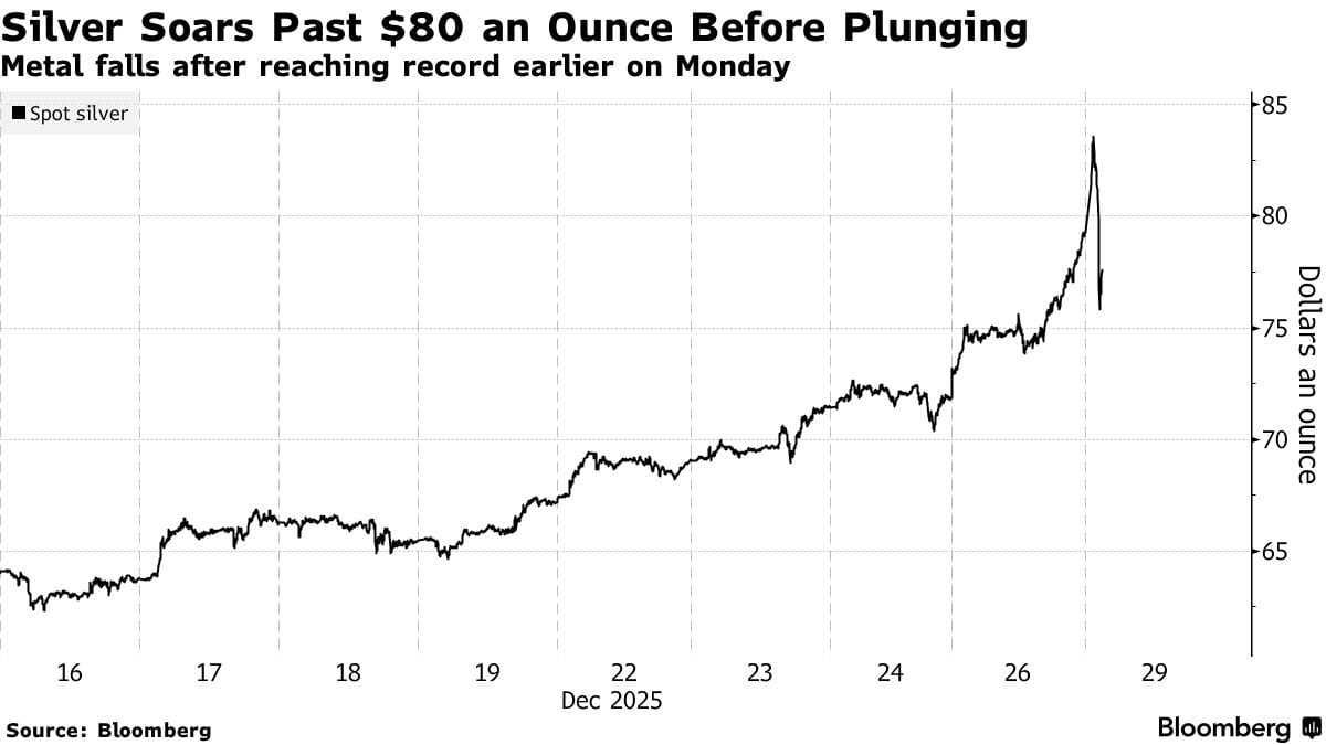 L’argento ha vissuto una fase di estrema volatilità dopo aver superato per la prima volta gli 80 dollari l’oncia, spinto da speculazione e da un marcato squilibrio tra domanda e offerta, mentre l’oro ha ritracciato dai massimi e il rame ha toccato un record storico. I metalli preziosi nel complesso beneficiano di tassi d’interesse più bassi, sostenuti dagli acquisti delle banche centrali, dai flussi verso gli ETF e dai recenti tagli della Federal Reserve, con il mercato che scommette su ulteriori riduzioni nel 2026. Nel caso dell’argento, la forte domanda industriale legata a energie rinnovabili, veicoli elettrici, data center per l’IA ed elettronica, unita a scorte in forte calo, alimenta timori di una possibile “bolla generazionale”. A rafforzare il rally contribuiscono anche fattori esterni, come i commenti di Elon Musk sull’importanza industriale dell’argento e le tensioni geopolitiche in Venezuela e Nigeria, che aumentano l’attrattiva dei metalli come beni rifugio.