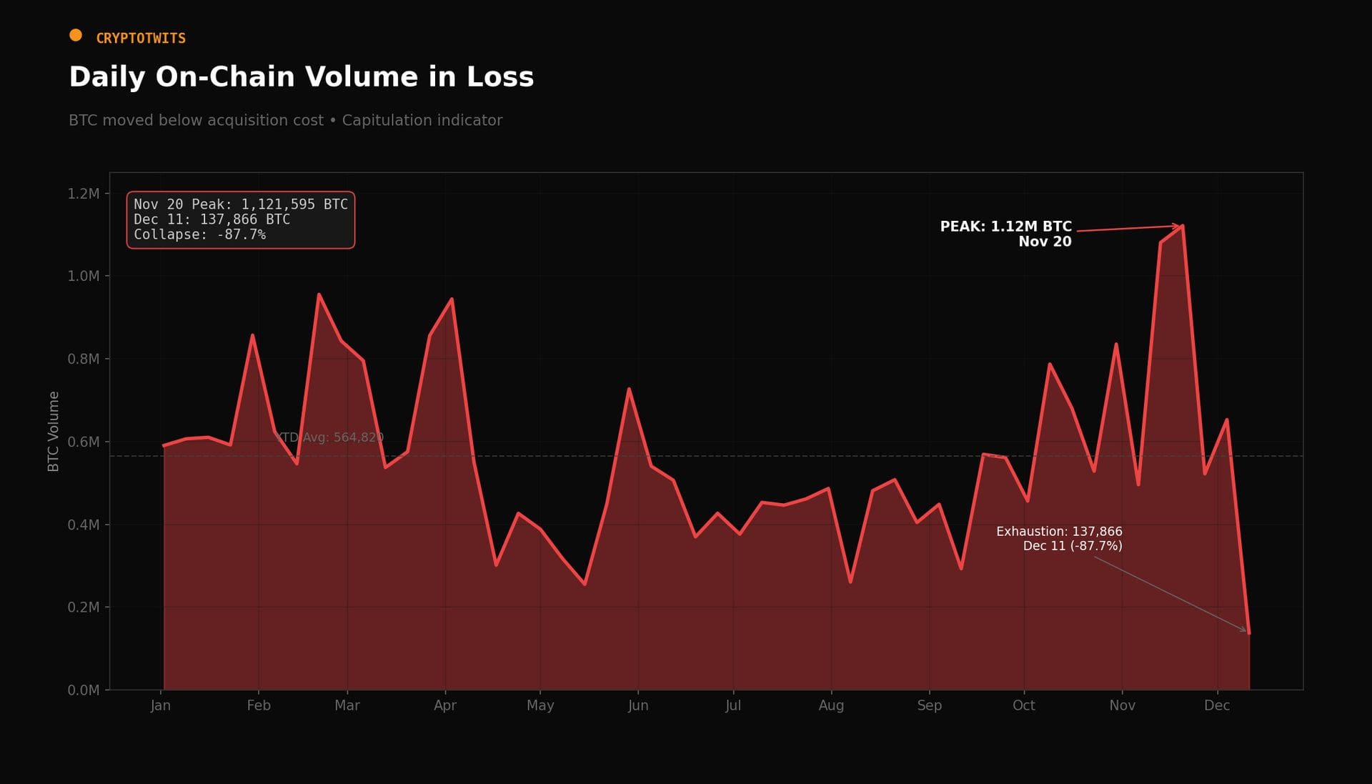 La risposta si trova nell’analisi dei Bitcoin scambiati in perdita, una metrica che indica chiaramente le fasi di capitolazione. A novembre 2025 si è verificata una massiccia liquidazione: per due settimane consecutive oltre 1,1 milioni di BTC sono stati venduti sotto il prezzo di acquisto, spazzando via trader con leva e investitori entrati su aspettative troppo ottimistiche. Questo ha provocato un forte reset della base degli holder. A inizio dicembre le vendite in perdita sono crollate dell’87%, segno che la pressione di vendita si è quasi esaurita. Un volume così elevato, però, non può essere spiegato solo dal panico del retail, indicando la presenza di una fonte di offerta più grande e di lungo periodo.