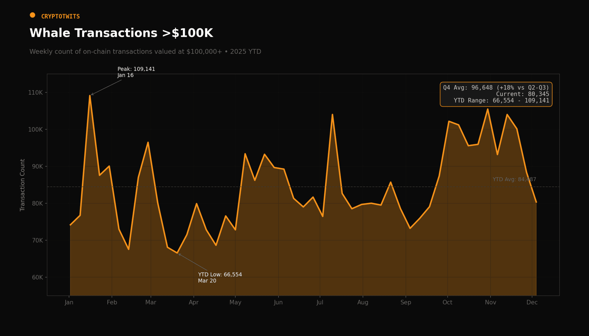 L’analisi mostra che nel 2025 le transazioni Bitcoin superiori a 100.000 dollari, tipiche di investitori ben capitalizzati e piccoli fondi, sono partite molto forti a gennaio per poi perdere rapidamente slancio. Dopo il picco di entusiasmo iniziale, l’attività è crollata a marzo e nei mesi successivi si è mantenuta stabile ma senza direzione, segno di incertezza. Un breve risveglio a ottobre non è stato sufficiente a cambiare il quadro e a dicembre i volumi sono tornati a scendere. In sintesi, questi operatori hanno agito con cautela e poca convinzione, mentre movimenti più importanti stavano avvenendo dietro le quinte del mercato.