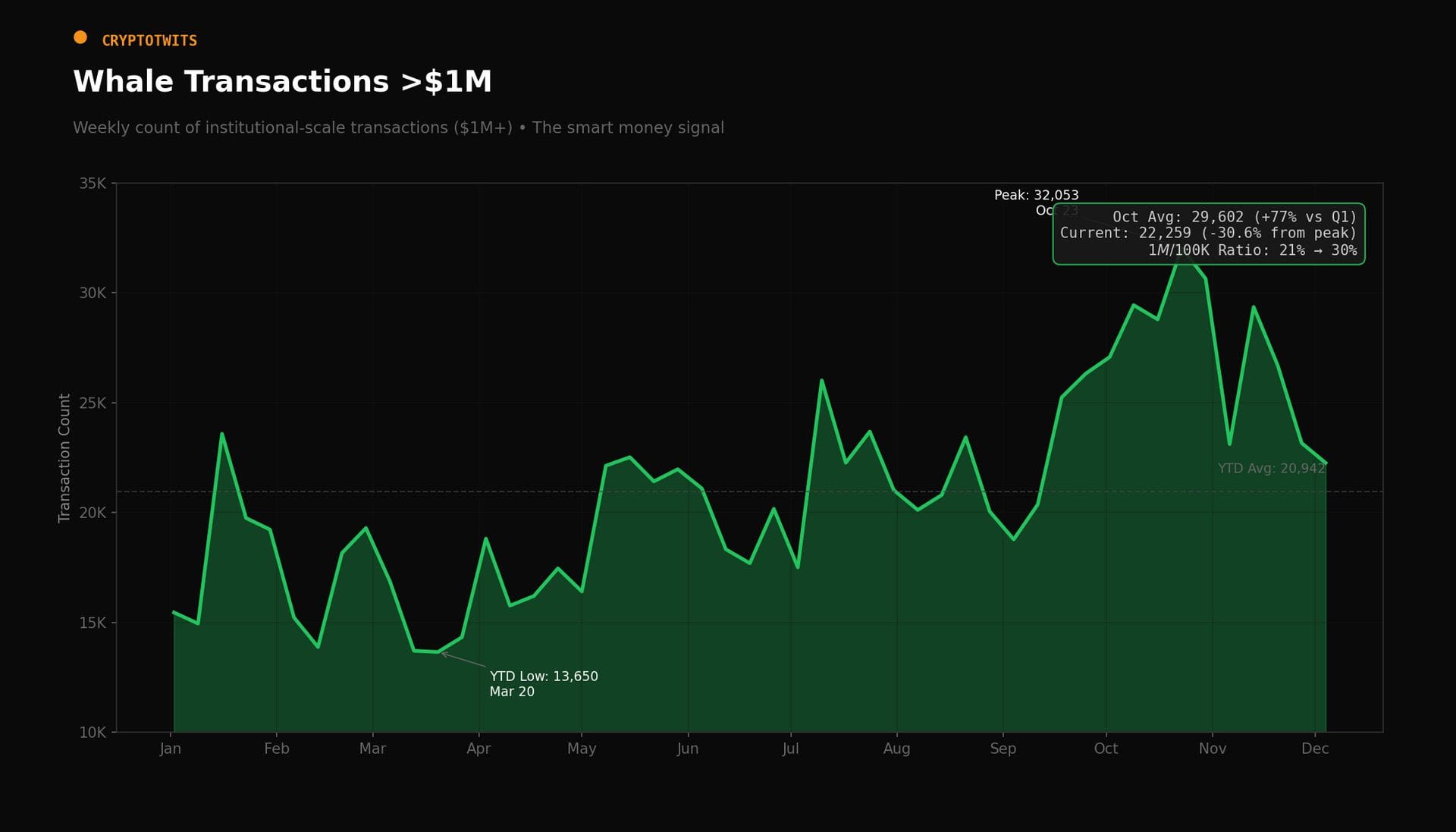 Osservando le transazioni superiori a 1 milione di dollari emerge il comportamento delle grandi istituzioni, come aziende, hedge fund e fondi sovrani. A inizio anno queste balene erano quasi assenti, nonostante l’euforia degli operatori più piccoli, ma nei mesi successivi la strategia è cambiata: durante l’estate, con prezzi deboli e poco interesse generale, hanno iniziato ad accumulare Bitcoin in modo graduale e discreto. L’attività è cresciuta nel secondo e terzo trimestre, fino a esplodere a ottobre, quando le transazioni di grande entità hanno raggiunto i massimi annuali, segnalando una forte presenza istituzionale. A dicembre i volumi sono diminuiti, indicando una fase di consolidamento e non di vendita. Resta quindi aperta la questione fondamentale: da chi hanno acquistato così tanti Bitcoin le istituzioni in autunno?