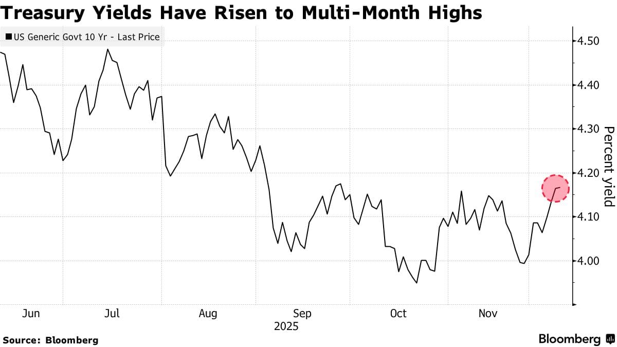 Il rendimento del Treasury decennale è salito di 4 punti base, raggiungendo il livello più alto da settembre. L’asta da 58 miliardi di dollari di titoli a tre anni ha mostrato una domanda migliore delle attese, mentre aste da 39 miliardi di dollari sui decennali e 22 miliardi sui trentennali sono previste nei giorni successivi. Kevin Hassett, candidato di punta alla presidenza della Fed, ha affermato che sarebbe irresponsabile definire già ora un percorso preciso per i tassi nei prossimi mesi, sottolineando la necessità di seguire i dati economici.